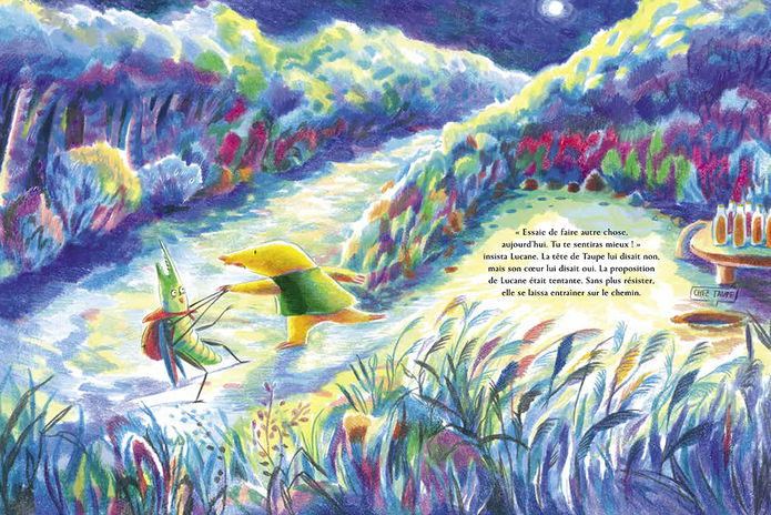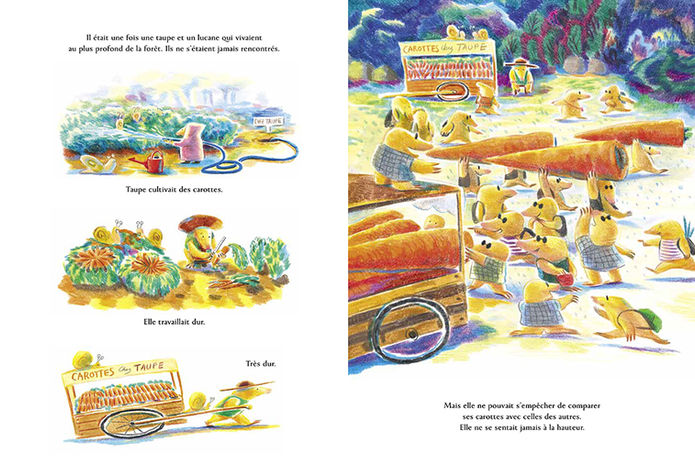Published in France in 2022 by éditions des éléphants, Courage, Petite Taupe (Stay strong, little Mole) is a story about coincidence and friendship. In a forest village, a mole puts all its effort into growing a giant carrot, while a stag beetle spends its days as a counselor, listening to the worries of other animals. One day, the mole bursts into tears after discovering that the harvested carrots are too small to sell. Meanwhile, the stag beetle, struck by stones thrown by dissatisfied animals, gazes up at the night sky with a broken jaw and a weary heart. Though they lead entirely different lives and have never met, these two characters